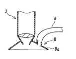 そこで、本発明者は、次に、図2に示すような構成のビーム加工装置を試作して、加工屑の吸引テストを行った。図示の試作機において、吸引管としての吸引ホース5の先端には、覆い部材8が設けられている。この覆い部材8は、透明導電膜103と所定の間隙を介して対向してそのビーム加工部分(ビーム照射部分)の周囲を覆う覆い8aと、吸引口6aに連通するようにこの覆い8aに設けられた連通口と、覆い8aに設けられた2つの貫通開口部8bとを備えており、加工ヘッド3の先端を貫通開口部8bに挿入させるように加工ヘッド3に装着されている。また、連通口の周囲は図中上側に突出しており、この突出した部分に吸引ホース5が接続されている。