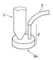 次に、本第1実施形態に係るビーム加工装置の特徴的な構成について説明する。図7、図8は、それぞれ上記加工ヘッド3の先端部分の斜視図、断面図である。これらの図に示すように、このビーム加工装置の吸引管6はその先端側がT字状に分かれており、一方は加工ヘッド3の先端に連結している。また、もう一方は、載置台4に向けて延びており、吸引口6aを加工対象物である透明導電膜103の表面に向けている。吸引管6の後端には吸引ホース5が接続され、更にこの吸引ホース5の後端には図示しない吸引力発生手段であるブロワが接続されている。