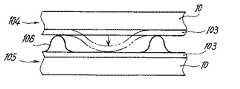図5は、本ビーム加工装置での透明導電膜103の加工によって電極パターンが形成されるタッチパネルの断面図である。また、図6(a)及び(b)はそれぞれ、同タッチパネルの分解斜視図及び平面図である。図5に示すように、タッチパネルは、各透明導電膜103からなる透明電極が通常状態で接触しないように1組の上下タッチパネル基板104、105を所定の高さ(例えば9〜12μm)のスペーサ106を介して対向させた構造になっている。そして、このタッチパネルを図5中の上方から押圧すると、上タッチパネル基板104が2点鎖線で示すように変形し、上下のタッチパネル基板104、105の透明電極同士が接触する。この接触による上下透明電極間の抵抗の変化から、押圧されたか否か及び押圧された位置を知ることができる。また、このタッチパネルは、図6(a)及び(b)に示すように上下のタッチパネル基板104、105のそれぞれに、互いに直交するスリット106、107が各透明導電膜103に形成されている。