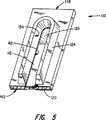 図3A〜図4Cに示された第2の好ましい実施形態の保持器アセンブリ110と図1A〜図2Bに示された第1の好ましい実施形態の保持器アセンブリ10との間の唯一の相違は、第1および第2案内溝124、126の傾斜特性である。理解されるように、第1および第2案内溝124、126は整列フレーム118の上側および下側部材128、130から概ね直角に延びている。しかしながら、図3Bおよび図3Cを特に参照すると、第1および第2案内溝124、126は各々、上側および下側部材128、130の平面から離れて延びるにつれて横方向外側に傾斜している内部に配置された係合面154を有している。整列フレーム118は好適には、傾斜係合面154が外科用留め具装着装置の並置されている顎部材に接触したときに第1および第2案内溝124、126が横方向外側に撓曲し得るように、プラスチックなどの略々可撓な弾性材料から構成される。