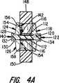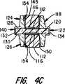 図4Aから図4Cは、本発明の第2の好ましい実施形態による、第1および第2外科用綿撒糸材料品112、114を各々に受容領域140内から取り外すために、外科用留め具装着装置の第1および第2顎部材148、150が第1および第2の斜切された案内溝124、126と係合する状態を示す、図3Cに示されている断面図と同様の断面図である。