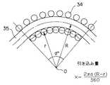 コイル34は自然状態(ストレート状態)では密着コイルなので、図6の内側のコイル部分の円弧の長さはストレート時と変わらない。しかしそれより外側になると、ストレート時よりも曲がったときの方が長くなる。つまり内側のコイル部分を基準にすると、ワイヤ35はコイル34内に引き込まれる。その引き込み量をxとすると、この引き込み量xは図6に示す式、つまりx=2πa(R−r)/360のように算出できる。  Since the