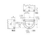 図3は指示具1の前面部分の詳細を説明する三面図である。第1の発光素子である赤外LED21A、21B、21Cは同一平面上に二等辺三角形の頂点に配置されている。赤外LED21A、21Bは指示具1の上面と平行に距離aを隔てており、赤外LED21Cは21Aと21Bを結ぶ線分の中央から垂直方向に距離bを隔てて配置されている。第2の発光素子である赤外LED21Eは、正面図では21Cの垂直方向に距離b/2を隔て、さらに奥へ距離dだけ進んだ位置に配置されている。LED21Eは、LED21A,B,Cで囲まれた平面と直交する位置に配置される必要はないが、図3に示すように配置することにより装置の小型化を図ることができる。
