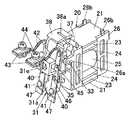 また、連動レバー31は仕切板31aを有しており、仕切板31aの左右両側面にそれぞれ接触子保持台31dが一体に突設され、接触子保持台31dには上記凹溝31bが形成される。仕切板31aの両側面には、接触子保持台31dとの対向面が開口する略コ字形に形成されたばね受け突部31eも突設される。ばね受け突部31eは、コイルばねよりなる接圧ばね34の一端部を保持する。接圧ばね34の他端は、接触子保持台31dとばね受け突部31eとの間に挿入される可動接触子40に弾接する。すなわち、2個の可動接触子40が1つの連動レバー31に保持されるのである。