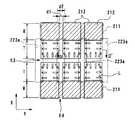 また、上基板220と電極223との間には赤色,緑色,青色の各カラーフィルタ(図9において、赤色及び緑色のカラーフィルタをそれぞれ符号221R,221Gで示す)からなるカラーフィルタ層121が設けられている。これらのカラーフィルタは画素電極213の形成位置に対応して複数配列形成されており、上述の共通電極223はカラーフィルタ層221を覆う形で形成されている。