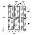 本変形例は上記第2実施形態における1ドット領域内の透過表示領域Tと反射表示領域Rの配置関係を変形したものである。すなわち、上記第2実施形態の構成では、X方向に並んだ複数のドット領域において透過表示領域Tと反射表示領域Rの位置関係は全て同じであるが、本変形例では、この位置関係をX方向に隣接したドット領域の間で逆転させた構造となっている。すなわち、本変形例では、領域E3を挟んで隣接するドット領域に対して反射膜211′を左右交互に配置し、これに合わせて液晶層厚調整層212′も領域E3を挟んで隣接するドット領域に対して左右交互に配置する。