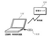 専用端末装置10は、専用の通信回線(以下、専用線と称する)で管理サーバ20と接続される。勿論、専用線に限らず、公衆電話回線などを介して管理サーバ20に接続するようにしてもよい。管理サーバ20は、一般的なサーバ装置と略同様の構成からなり、後述する、UIDとディスク100の属性情報とを関連付けるデータベースを有すると共に、UIDにより特定されるディスク100の利用可能情報を管理する。