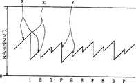 図1において、各線分xの傾きは伝送するデータストリームの固定ビツトレートを示し、当該各線分xの各位置x1はVBVバツフアにおけるデータ占有量を表している。また線分yは1フレーム分のデータがVBVバツフアからIピクチヤ、Bピクチヤ及びPピクチヤとして読み出されたことにより、VBVバツフアのデータ占有量が急に減少することを示している。