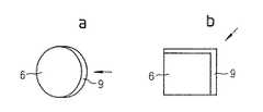 開口8を形成する異方性エッチング工程で平面図で丸形にパターン化された層列が形成されると、領域9は厚みを減らして積層の周囲の一定部分を覆う。長方形の積層の場合積層の一辺だけ又は積層の二辺の縁をp+ドープすることが可能となり、それにより領域9が積層の一辺だけに存在するか又は積層の二辺を角形に覆う。このように形成された積層の直径又は幅は約1μmである。図4のa、bは図1のcによりパターン化及びドープされた積層の実施例を示すものである。注入が行われた方向はそれぞれ矢印で示されている。図4に示された例では形成すべきコンデンサにとって極めて安定なパターンが生じる。