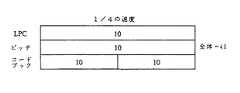 1/2速度において、図3に示されているように各ピッチサブフレーム20に対して2つのコードブックサブフレーム22が存在する。ピッチは2つの各ピッチフレーム20のそれぞれに対して1度づつ2度更新され、一方コードブックは4つの各コードブックサブフレーム22に対して1度づつ4度更新される。1/4の速度において、図4に示されているように、単一のピッチサブフレーム24に対して2つのコードブックサブフレーム26が存在する。ピッチはピッチサブフレーム24に対して1度更新され、一方コードブックは2つの各コードブックサブフレーム26に対して1度づつ2度更新される。図5に示されているように、1/8の速度においてピッチは決定されず、コードブックはフレーム10に対応したフレーム28において一度だけ更新される。  At 1/2 speed, there are two