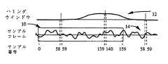 図面を参照すると、特に図1において、LPC解析はハミングウインドウ12を使用してウインドウ化されるフレーム10の 160個のスピーチデータサンプルを使用して行われる。図1に示されているように、サンプルs(n)は各フレーム内において 0乃至159 の番号を付けられる。ハミングウインドウ12は、それが60個のサンプルによってフレーム10内においてオフセットされるように位置される。したがって、ハミングウインドウ12は現在のデータフレム10の60番目のサンプル、s(59)でスタートして連続し、後続するデータフレーム14の59番目のサンプル、s(58)を含む。したがって、現在のフレームであるフレーム10に対して生成された加重されたデータはまた次のフレームであるフレーム14からのデータに基づいたデータを含む。  Referring to the drawings, particularly in FIG. 1, LPC analysis is performed using 160 speech data samples of