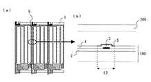 近年、例えば特開平8−254712号公報で開示されているように、アクティブマトリクス型の液晶表示装置において、液晶に印加する電界の方向を基板に対して平行な方向とする横方向電界方式が、主に超広視野角を得る手法として用いられている。この方式を採用すると、視角方向を変化させた際のコントラストの変化、階調レベルの反転がほとんど無くなることが明らかにされている(参考文献:M.Oh-e, 他,Asia Display'95,pp.577-580)。図13(a)は、従来の一般的な横方向電界方式の液晶表示装置の画素部を示す平面図である。そして、図13(b)は、その一部を拡大した断面図である。図において、100はTFTアレイ基板、200はカラーフィルタ(CF)基板である。また、1は絶縁性基板上に形成された複数本の走査信号線であるゲート配線、2はゲート絶縁膜、3はソース配線、4はソース配線3上に設けられた絶縁膜、5a、5bはゲート配線と同層に設けられた共通電極である。特に、この例では、共通電極5は、共通電極5a及び共通電極5bに分離して配置されている。そのため、ソース配線に電圧が印加された状態においては、その電圧によって電界Eが発生し、TFTアレイ基板100とCF基板200の間に設けられた液晶の配向状態を変えてしまう。このため、図13に示される構成では、結局図上L1で示される幅が広く必要であり光の透過が制限されるため、開口率が低くなるという問題点もあった。