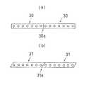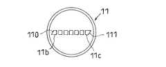 図6は、第2実施形態に係るダイス11の構成を示す図である。図5では、開口部11aの形状は全て同じであったが、図6では、幅方向両端に位置する開口部11b,11cについては、断面が台形となっている。特に、幅方向最両端の辺110,111が斜辺に形成されており、かつ、同じ角度の傾斜となっている。図5に示すダイスの場合、マルチコード30の断面形状は、長方形となる。このマルチコード30を巻付ドラムに巻き付けていく場合を考えると、図8(a)に示すように、隣接するマルチコード30の端部30aの突き合わせを精度よく行わないと、端部30aと端部30aの間に隙間が形成されたり、一方の端部30aが他方の端部30aに乗り上げたりするので、所望の形状が得られないことがありうる。そこで、図6に示すようなダイス11を用いれば、図8(b)に示すように、マルチコード31の端部30aが垂直ではなく斜辺となる。これにより、マルチコード31の端部31aどうしの突合せをスムーズに接合することができる。