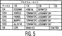 次に、本発明の理解を容易にするために、以下に示す例を参照して説明することにする。図2に示すように、視聴者は現在、チャネル105Aで"Seinfeld"を見ているところである。リモートコントロールなどの、キーパッド入力システムから該当のキーを押すと、EPGディスプレイは"Seinfeld"をハイライト(高輝度表示)にして表示される。視聴者が右矢印キーまたはその同等キーを押すと、EPGディスプレイは図3に示すものに変わり、"Terminator  2:  Judgement  Day"がハイライト(高輝度表示)になる。なお、ここで4チャネル(105A、105B、105C、105D)すべてがハイライト(高輝度表示)になっているのは、この映画がHDTVで放送中で、チャネル105用に予約された利用可能バンド幅をすべて使用しているためである。視聴者が下矢印キーを押すと、"Miami  Vice"が図4に示すようにSDTVフォーマットでハイライト(高輝度表示)になる。以上から理解されるように、視聴者は下矢印キーを4回押さなくても"Miami  Vice"に到達している。