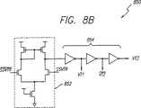 図8Aおよび8Bは、図4のコンパレータ435の回路の詳細を示す概略図である。各コンパレータ435は、図7Aの差動増幅器702に類似した差動増幅器802(図8A)または852(図8B)、および縦列した多重インバータ804(図8A)または854(図8B)を含む。コンパレータ802および852のフル・レール出力信号(VT1、VT2、VT3、/VT1、/VT2&/VT3)は、単一端受信器のXOR425(図4)に伝送される。VT1、VT2またはVT3の選択は、受信器405の出力信号SN生成経路の信号速度と実質的に等しい信号速度に基づいて決定される。