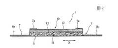 図1および図3に示すように、前記接合線14は、X方向に直線状に延びており、Y方向へ一定のピッチで形成されている。前記接合線14を少なくとも2本、好ましくは4本以上含む長さで前記3層の接合体を切断することにより、図1に示すような構造体10が製造される。