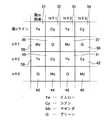 1は、撮像手段たるCCDであり、受光された映像を電気信号に変換して蓄積し、そのアナログ信号を出力する。CCD1の受光部の表面にはカラーフィルターが設けられている。カラーフィルターには、例えば、イエロー(Ye)、シアン(Cy)、マゼンダ(Mz)およびグリーン(G)からなる補色系カラーフィルターや、レッド(R)、グリーン(G)およびブルー(B)からなる純色系カラーフィルターがあり、その配列などを組み合わせると様々な種類のCCDを使用することができる。なお、本発明の第1の実施の形態に係る信号処理装置のCCD1では、例えば、図2に示すように、第nラインの画素31、32、33および34、また、第n+2の画素39、40、41および42において、2画素周期の配列でYeとCyのカラーフィルタの色を割り当て、第n+1ラインの画素35、36、37および38、また、第n+3の画素43、44、45および46において2画素周期の配列でMzとGのカラーフィルタの色を割り当てている。すなわち、Ye、Cy、GおよびMzの色からなるカラーフィルターを割り当てた2画素周期の配列の補色系カラーフィルターを使用する。