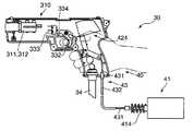 信号ケーブル34は、具体的には、チューブ状に形成された屈曲自在の所謂ハーネス(蛇腹)に挿通され、このハーネスの外表面には例えばゴム材からなる保護材(保護チューブ)が装着されている。信号ケーブル34は、本体筐体部20の例えば前面側の導入位置26において内部へ導入されるとともに、導入位置26でのハーネスの基端部の本体筐体部20への固定により、銃本体310を移動自在に支持している。なお、信号ケーブル34は銃本体310の盗難防止用としても機能する。  Specifically, the