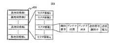 図6〜8は基地局情報テーブルの構成例である。同図において、三行毎に太線で囲まれた部分が一つの基地局情報であり、各行はそれぞれの基地局情報に含まれる一つのセクタ情報を示す。識別番号には、TIA/EIA-95における例えばBASE_IDを設定する。あるいは、TIA/EIA-95におけるBASE_IDに加え、SID、NID、BAND_CLASSあるいはCDMA_FREQといったそれぞれのセクタを特定するためのパラメータ値を併記して設定してもよい。アンテナ位置には、該セクタを形成するために用いられる送信アンテナの位置を設定する。位置のフォーマットは、例えば、緯度・経度でもよいし、局所的な地域に限定可能なら平面直角座標系を用いてもよい。図6の例では平面直角座標系で、西から東への向きをY軸正方向、南から北への向きをX軸正方向として、アンテナの位置を表している。アンテナ向きには、該セクタを形成するために用いられる送信アンテナの向きを設定する。向きのフォーマットは、例えば、Y軸正方向を0°とし、反時計回りを正方向として設定する。送信符号識別子には、該セクタにおいて用いられている送信符号を特定するための識別子を、例えば、TIA/EIA-95におけるPILOT_PNを設定する。