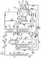 これに対して、電子制御装置33からは、エンジン51を制御する信号、四方弁17を制御する信号、三方弁27を制御する信号、ダンパ21C,36を制御する信号、第1のポンプ28および第2のポンプ29の出力を制御する信号、油圧制御装置76を制御する信号などが出力される。また、コンプレッサ1、ファン5,24が、エンジン51以外の電動機50により駆動される場合は、電動機50、コンプレッサ1、ファン5,24の駆動・停止を制御する信号が、電子制御装置33から出力される。