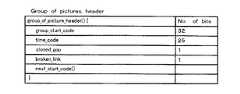 FIG. 18 shows the contents of the Sequence header. For example, horizontal size value (12 bits) represents the number of horizontal pixels of the image, and bit rate value represents the bit rate. FIG. 19 shows the contents of the Group of pictures header. For example, time code indicates the time from the beginning of the sequence, and closed gop indicates that an image in the GOP can be reproduced independently of other GOPs. FIG. 20 shows the contents of the picture header. For example, picture coding type indicates the picture type, and full pel forward vector indicates whether the accuracy of the motion vector is an integer pixel or a half pixel unit.