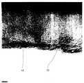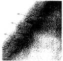 図から明らかなように、傾斜した炭素網層10を覆って、アモルファス状の余剰炭素が堆積した堆積層12が形成されていることがわかる。14は中心孔である。