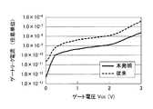 図3は、第1の実施形態に係るHEMT(本発明のHEMT)のゲートリーク電流と、図10に示す従来のMOSFET(ゲート絶縁膜上に直接金属電極が形成されているMOSFET)のゲートリーク電流とを、ゲートサイズ等を同一条件に揃えて比較した結果を示している。図3において、横軸にはゲート電圧値(ゲート・ソース間電圧値)VGSを示しており、縦軸にはゲートリーク電流(任意単位)を示している。また、図3において、本発明のHEMTのゲートリーク電流を実線で示していると共に、従来のMOSFETのゲートリーク電流を破線で示している。図3から明らかなように、第1の実施形態に係るHEMTにおいては、ゲートリーク電流が極めて低く抑制されている。