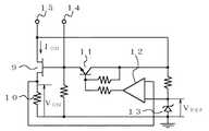 例えば、画素スイッチング用の薄膜トランジスタと同時にモニター用の薄膜トランジスタを形成し、モニター用の薄膜トランジスタのオン電流ION(又はこれに関連するパラメータ)を検出して、パネル温度によらず一定となるようにゲートオン電圧VGONを設定することを特徴とするものである。図5は、このような温度検出手段8の回路構成例を説明するための回路図である。ここで、電源は端子15より供給される。薄膜トランジスタ9はモニター用であり液晶表示パネル1の内部に設けられ、このモニター用薄膜トランジスタ9がオンしているときのオン電流で決まる電圧VONと基準電圧VREF(抵抗R13とツェナーダイオード13とで構成された基準電圧源が出力する)との差電圧を増幅して制御トランジスタ11を制御し、モニター用薄膜トランジスタ9のゲートにオン電流を一定にするようにフィードバックするとともに、補正信号として端子14に出力する。この補正信号は、DC/DCコンバータ4に出力される。また共通電圧中心VCOMセンタも温度補正を行う。