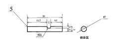 図2に示した基板(2)は、縦50mm、横50mm、厚さ2mmのポリカーボナイト板で作成した。該基板は、図2に示したように、流路として基板1の6mmの雌ネジ穴(101)に対応する位置に直径1mmの穴(201)、棒状部材(5)が挿入され移動が可能なクリアランスを持つ直径3mmの穴(202)、流路としてこれらの穴を結ぶ深さ1mm、幅1mmの溝(204)、圧着に用いるステンレス製の2mmのナベネジが貫通できるような直径2mmの穴(203)が加工されている。