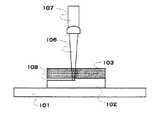 以上のようにして作製したTFTは、低温プロセスといえどもプロセス温度として400℃程度の温度が必要なため、たとえば樹脂基板やプラスティック基板などの耐熱性の低い基板上に作製することは現状では不可能である。従って、TFTはガラスなどの基板上に作製し、しかる後にこれらの素子を任意の基板に転写することができると任意の基板上に薄膜トランジスタを形成することができるようになる。レーザーを利用して素子を転写する方法に関しては様々な技術が報告されているが、例えばJapanese Journal of Applied Physics Vol.38 (1999)pp.L217はごく最近報告された転写技術の一つである。これは図3に示すように窒化ガリウム102の表面にレーザー照射106をし、レーザーを吸収した最表面の熱励起による分解(窒素ガス108が発生)を利用して、素子を基板から分離する方法である。しかしながら、熱分解を促すために基板をホットプレート101で600℃に加熱する必要があり耐熱性の低い転写先基板を使うことができない。また、窒化ガリウムという特殊な材料を用いなければならないためこの犠牲層の上にTFTなどのシリコン系素子を作製するのはプロセスの制約上、困難であるといわざるを得ない。