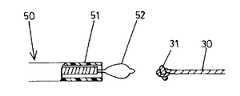 そして、例えば図14に示される内視鏡用スネア状の回収具50の先端ループワイヤ52を、図15と図16にその動作が順に示されるように瘤状部31に引っかけて外套管51の先端内に引き込み、外套管51ごと体外に引き出すことにより留置バスケット10を回収することができる。図14中の53は、先端ループワイヤ52を可撓性チューブ51内に挿脱させてループ径を変化させる操作を行うための操作部である。