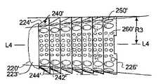 図3Aを参照するに、移植片220に代わる他の実施例が移植片220’で示されている。移植片220’は移植片220と同様な構造を有するが、その本体が截頭円錐形を有すると共に、挿入端224’から後端226’まですべての鋸歯状部240’が縦軸線L4から測って一定の半径R3を有する点では違っている。鋸歯状部240’の高さは本体(鋸歯状部を除いた部分)から測って移植片220’の全体にわたり異なった高さを有する。このようにして、鋸歯状部240’は移植片220’のほぼ円筒形の外面形状を画定し、一方本体は截頭円錐形を有する。移植片220’の挿入を容易にするために移植片220’の挿入端224’は小直径のテーパ部223’を有する。  Referring to FIG. 3A, another alternative to the