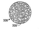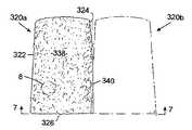 図6〜8には、本発明の他の実施例による椎骨融合移植片320aが示されている。移植片320aは鎖線で示した他の同一の移植片320bと並べて配置されている。移植片320aは、金属から製作してもよい糸を一緒に圧縮して、隣接する椎骨と接触する部分に沿う移植片320aの部分にほぼ沿っている部分的な截頭円錐形に成形した、網状材料より構成される本体322を有する。移植片320aは挿入端324と後端326とを有する。移植片320aは全部又は部分的にむくの、及び/又は多孔質の、及び/又は網状の材料から製作することができる。移植片320aは多孔質材料、網状材料、又は粗化した表面を有することができる。移植片320aはむくでも良いし、部分的に中空でも良いし、少なくとも1つの内室を有してもよい。図8に示したように、網状材料は成形され且つ圧縮一体化された多数の糸よりなり、それにより融合促進物質を保持することができ且つ骨の内方成長を可能にする間隙部339が、移植片320aの少なくとも外表面338に存在するようにする。  FIGS. 6-8 illustrate a
