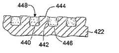 図12を参照すると、移植片420の表面438の拡大図が示されている。好ましい実施例では、柱状体440は頭部444が残りの部分よりも大きい直径を有し、それらの間の各凹所442は柱状体440とは逆の形状を有する。この凹所442と柱状体440の構成によると、骨物質の表面438への保持作用が大きくなり、さらに骨の内方成長により生成される骨融合塊への係止力が向上する。骨の内方成長は凹所442の底446へ向けて成長するにつれて幅が広くなるので、骨の内方成長は入口448から出ていくことは出来ず、凹所に閉じ込められる。移植片420の表面438は利用可能な表面積を増大するが、さらに粗化、フロック処理、又は他の表面を非平滑にする方法により、この表面積をさらに増すことが出来る。  Referring to FIG. 12, an enlarged view of the