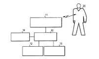 図1は、本発明に従ったシステムの基本原理を説明している。このシステムのコアは、中央ユニット10によって形成されており、前記中央ユニット10は、システムの作用をコントロールするものである。ユーザ20に関する身体現象を測定する、個別モニタリングユニット11は、中央ユニット10に接続される。これらの測定に基づいて、中央ユニット10は、ユーザに提供される情報及び/またはその情報の表示の仕方を選択する。  FIG. 1 illustrates the basic principle of a system according to the invention. The core of this system is formed by a