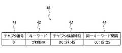 また、その番組録画装置において、前記字幕データ(31)解析部(12)は、前記キーワードと前記チャプタ候補時刻とを関連付けたレコードを生成して前記初期チャプタ情報テーブル(33)を構成する。このとき、前記チャプタ候補時刻に対応付けられた前記キーワードが、所定の時間を越えて再度字幕として出現するときには、前記キーワードが新たに出現する時刻を新たなチャプタ候補時刻として特定する。さらに、前記チャプタ候補時刻と前記新たなチャプタ候補時刻との時間差であるキーワード出現間隔と前記新たなチャプタ候補時刻と前記キーワードとを関連付けて新たなレコードを生成する。そのうえで、前記レコードの総数が所定の数を超えるとき、前記出現間隔が短いレコードを削除して、新たなレコードを前記初期チャプタ情報テーブル(33)に追加する。 In the program recording apparatus, the caption data (31) analysis unit (12) generates a record in which the keyword and the chapter candidate time are associated with each other, and configures the initial chapter information table (33). At this time, when the keyword associated with the chapter candidate time appears again as a caption after a predetermined time, the time at which the keyword newly appears is specified as a new chapter candidate time. Further, a new record is generated by associating a keyword appearance interval, which is a time difference between the chapter candidate time and the new chapter candidate time, the new chapter candidate time, and the keyword. In addition, when the total number of records exceeds a predetermined number, records with a short appearance interval are deleted, and new records are added to the initial chapter information table (33).