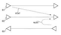 ところで、SNRを測定して各キャリアのパワー配分及びビット配分を求める場合には、漏話雑音を考慮する必要がある。一般に、漏話には遠端漏話と近端漏話とがある。これらについて、図6を参照して説明する。同図において、測定対象として着目している信号線路60と同一方向に信号が流れる信号線路61を漏話源とするものが遠端漏話FEXTである。本来伝送すべき信号も伝送距離と共に減衰するので、伝送距離に応じてこの遠端漏話FEXTの量も相対的に減衰する。したがって、この遠端漏話FEXTが発生している時には伝送距離に関わらずSNRは高い値を示すことになる。  By the way, when measuring the SNR and determining the power distribution and bit distribution of each carrier, it is necessary to consider crosstalk noise. In general, crosstalk includes far-end crosstalk and near-end crosstalk. These will be described with reference to FIG. In the figure, the far-end crosstalk FEXT is a signal having a signal line 61 in which a signal flows in the same direction as the