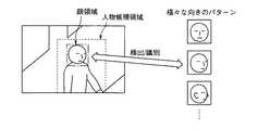 この手法の他に、目・鼻・口などの標準パターンを用意し、そのパターンと人物領域とのマッチングをとり、パターンの位置関係から顔の向きを認識してもよい。 In addition to this method, a standard pattern such as eyes / nose / mouth may be prepared, the pattern may be matched with a person region, and the face orientation may be recognized from the pattern positional relationship.