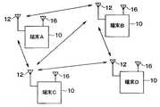 本第1実施形態では、図2に示すように、このような通信端末装置10(端末A)が、制御局や基地局などを介さず、直接、他の通信端末装置10(端末B、C)とデータの送受を行う。さらに、この他の通信端末装置(端末B、C)がその他の通信端末装置(端末D)とデータの送受を行う。したがって、端末Aは、端末B、Cと直接通信を行い、端末Dと間接的に接続可能である。以下、直接、または、間接に通信可能な他の通信端末装置の集合を通信網と称する。また、通信端末装置を、単に「端末」と称し、さらには自らの端末を「自局」、他の端末を「他局」とも称する。