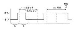 ステップa2において、第1CPU13は、外部スイッチ49の定期的な感知タイミングt2(t2は、たとえば100ミリsec)経過したか否かを判断する(図28参照)。「否」との判断でステップa1に戻る。t2経過したとの判断でステップa8に移行して、第1CPU13は外部スイッチ49がオンしたか否かを判断し、「否」との判断でステップa1に戻る。オンしたと判断されるとステップa9に移行し、第1CPU13は、予め定める信号判定時間Tswしたか否かを判断する。この信号判定時間Tswは、感知タイミングt2よりも大きく設定される。オフからオンに切換えられた時点から信号判定時間Tswの計時が開始され、オンとなっている連続時間が時間Tswに達すると、信号判定時間Tsw経過したと判断する。信号判定時間Tsw経過していないと判断されると、ステップa1に戻る。信号判定時間Tsw経過したと判断されると、ステップa10に移行して第1CPU13は外部スイッチ49を検知した後、ステップa7に移行する。前記信号判定時間Tswを設けることで、ノイズ等の誤動作を防止することができる。  In step a2, the