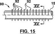 螺旋状のフィンを有する螺旋状の撹拌器はこれまで、マニホールドチャンバ32C内に配置されることになる吸込み管15の部分の周囲にワイヤ又はその他の部材を螺旋状に巻き付けられて固定されることにより比較的容易に大量生産することができるような構成の、吸込み管が取付けられた撹拌器の好ましい実施の形態として説明されてきた。しかしながらいくつかの実施の形態において、吸込み管15に沿って他の流れ増加構造が設けられることによってマニホールドチャンバ32Cの板対20の間で開口38を通過する液相流体を分散するようにしてもよい。たとえば、図15及び図15Aは、液相流体の流れを細分化及び分散するために吸込み管15の周囲に径方向に延伸する一連の環状のリング92を螺旋状のフィンに代えて有する、マニホールドチャンバ32C内で使用可能な更なる撹拌器90を示す。図16に示されるように、吸込み管15に沿って長手方向のリブ94が、各リング92の内側に設けられた対応する溝内に受入れられるように設けられていて、管15上におけるリングの位置決めを補助するようにしてあってもよい。また代わりに、吸込み管15の長手方向に沿って、各リング92の内面に設けられたバリを受入れる溝が設けられてもよい。図17及び図17Aは、吸込み管15の長さ方向に沿って径方向に延伸する一連のリング98を含む点において撹拌器90と類似している更なる使用可能な撹拌器96を示す。しかしながら、リング98及び管15は一体構成であって、リング98は、管15のセクションをその長さ方向に沿って間隔をあけて周期的に圧縮することにより形成される。  A helical stirrer with helical fins has heretofore been fixed by helically winding a wire or other member around the portion of the