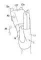 本参考例における触力覚呈示部13は、図9に示すように、装着部11に装着された手の指が並ぶ方向における装着部11の両端部においてそれぞれ一端部が軸支された2本の柱状の回転部13eを備える。一方の回転部13eには回転部の周方向に沿った2方向に回転可能な駆動ローラ(図示せず)と駆動ローラを駆動するローラ駆動手段(図示せず)とが設けられ、他方の回転部13eには駆動ローラと同じ方向に回転可能な従動ローラ(図示せず)が設けられている。駆動ローラと従動ローラとの間には無端ベルト13fが張設されていて、各回転部13eは、装着部11が装着された手の指に無端ベルト13fが接触する位置と装着部11が装着された手の指から無端ベルト13fが離れる位置との間でそれぞれ矢印A8で示す方向に回転可能となっている。駆動ローラの回転に伴って、無端ベルト13fにおいて装着部11が装着された手の指に接触する部位が装着部11が装着された手の指が並ぶ方向に移動するように、無端ベルト13fは搬送される。