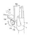 本参考例における触力覚呈示部13は、図10に示すように、装着部11が装着された手の指に対向する位置において一部が露出し触力覚呈示部13の他の部位に対して中心の位置を変化させずに矢印A11で示すように回転可能な球状部13gと、板状であって一端部において装着部11に軸支され装着部11が装着された手の指に球状部13gが接触する位置と装着部11が装着された手から球状部13gが離れる位置との間で駆動手段14に駆動されて矢印A10で示すように回転可能な本体部13kとを備える。触力覚呈示部13には、互いに異なる方向に球状部13gを回転させる2つの球状部駆動手段(図示せず)が設けられている。球状部駆動手段としては、例えば直流モータと、直流モータの回転軸に取り付けられ球状部13gの表面との間に摩擦力を生じるローラとを用いる。