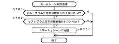 ステップS701では、今回の注目ショットに関して、前記動き方向ヒストグラムHDを量子化して得られるヒストグラム分布の分散DHDが基準分散値DHDrefと比較される。ここで、図10(a)に示したように、ヒストグラム分布の分散DHDが大きく、その値が基準分散値DHDrefを上回っていれば、注目ショットをズームシーンに分類することなく当該処理を終了する。