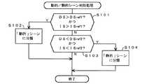 ステップS101では、前記ショット分割部10のショット密度検知部102で検知されたショット密度DSが第1基準密度DSref1と比較され、さらに、前記動き情報解析部12の動き強度検出部121で検出された動き強度ISが第1基準強度ISref1と比較される。ここで、[DS>DSref1かつIS>ISref1]が成立すればステップS102へ進み、今回の注目ショットが「動的」シ−ンに分類される。前記ステップS101において、前記[DS>DSref1かつIS>ISref1]が成立しなければステップS103へ進む。