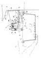 前記開口部10の左右開口端に図3及び図5に示すように突出壁27をそれぞれ垂設し、これらの突出壁27,27の内側面に可動底板11を下傾させた状態を保持させる突条28,28を傾斜させて対設している。さらにコイン皿7の後側壁8cの下端に図6に示すように逆L字形の支持片29を突設している。該支持片29はコイン貯留容器Aの上端縁の鍔部を支持するためのものである。