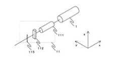 図1のビーム成形光学系11の構成を図4に示す。図4でレーザ光源1を出射したレーザビームは径が1mm程度であるので、ビームエキスパンダ111により、ビーム径を数mmから十数mmに拡大する。拡大されたビームはシリンドリカルレンズ112によりこのシリンドリカルレンズの焦点付近115でスポットの長手方向は数mmから十数mmのままで、狭い方向はサブmm程度に絞り込まれている。この焦点位置は対物レンズにより、被検査ビーズの頂点とほぼ共役な位置関係にある。従ってこのビーム成形光学系11を通過したレーザ光はビーズ上に溝の方向と直角な方向に長細い励起光を照射する。  The configuration of the beam shaping