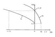図27は、nチャネルMOSトランジスタのしきい値電圧Vthの、バックゲート(基板領域)とソース間の電位差VBSに対する変化を概略的に示す図である。図27において、曲線T1は、バックゲート−ソース間電位差VBSが0Vのときのしきい値電圧が0.1VのnチャネルMOSトランジスタのしきい値電圧Vthを示し、曲線T2は、バックゲート−ソース間電位差VBSが0Vのときのしきい値電圧が0.28VのnチャネルMOSトランジスタのしきい値電圧Vthを示す。図27においては、縦軸にしきい値電圧Vthを示し、横軸にバックゲート−ソース間電位差VBSを示す。また、これらの曲線T1およびT2は、後に説明する基板効果定数Kが0.4として次式(1)に従って求められている。