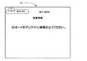 カラオケ活用無線端末30は新規会員の登録手続も受け付ける。一時的な参加者登録とあわせて会員登録もしたい参加者は、上記参加者登録の手順に先立ってICカードのIDをカラオケ活用無線端末30に読み込ませる操作を行う。図9、図10にその操作にともなう画面遷移を示した。まず、トップ画面120の「MY BOX」ボタン122を指示し、My BOXサービスの一覧を含むMy BOXメニュー画面(図9:170)を表示させる。参加者がこの一覧にある「会員登録」ボタン171を指示するとカードIDの登録を促す記載を含んだ案内画面が表示される(図10:180)。参加者がこの案内に従ってICカードをアンテナ45に接触させると、カードインタフェース46は、アンテナ部45を介して受け取った変調電波を復調し、その復調信号に多重化されているカードIDのコードを抽出してそのコードをリモコン制御部34に転送する。リモコン制御部34は、カードIDのコードを受け取ると新規の参加者フォルダを作成する。このフォルダにカラオケ活用無線端末30内でユニークなフォルダ名を付与し、カードIDをその参加者フォルダに登録する。カラオケ活用無線端末30は、このようにして会員IDの登録を終えると、先の参加者登録開始画面130を表示し、以後は上述の参加者登録手順に従って、個人識別標章や名前の登録を受け付ける。参加者フォルダでは個人識別標章の画像ファイル名と名前とが対応付けされ、会員登録した参加者については会員IDも対応付けされている。=== Member Registration and Member Authentication ===