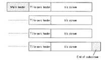 図6には、この符号列データの1フレーム分の概略構成を示している。この符号列データの先頭と各タイルの符号データ(bit stream)の先頭にはヘッダ(メインヘッダ(Main header)、タイル境界位置情報等であるタイルパートヘッダ(tile part header))と呼ばれるタグ情報が付加され、その後に、各タイルの符号化データが続く。なお、メインヘッダ(Main header)には、符号化パラメータや量子化パラメータが記述されている。そして、符号列データの終端には、再びタグ(end of codestream)が置かれる。また、図7は、符号化されたウェーブレット係数値が収容されたパケットをサブバンド毎に表わしたコードストリーム構造を示すものである。図7に示すように、タイルによる分割処理を行っても、あるいはタイルによる分割処理を行わなくても、同様のパケット列構造を持つことになる。
